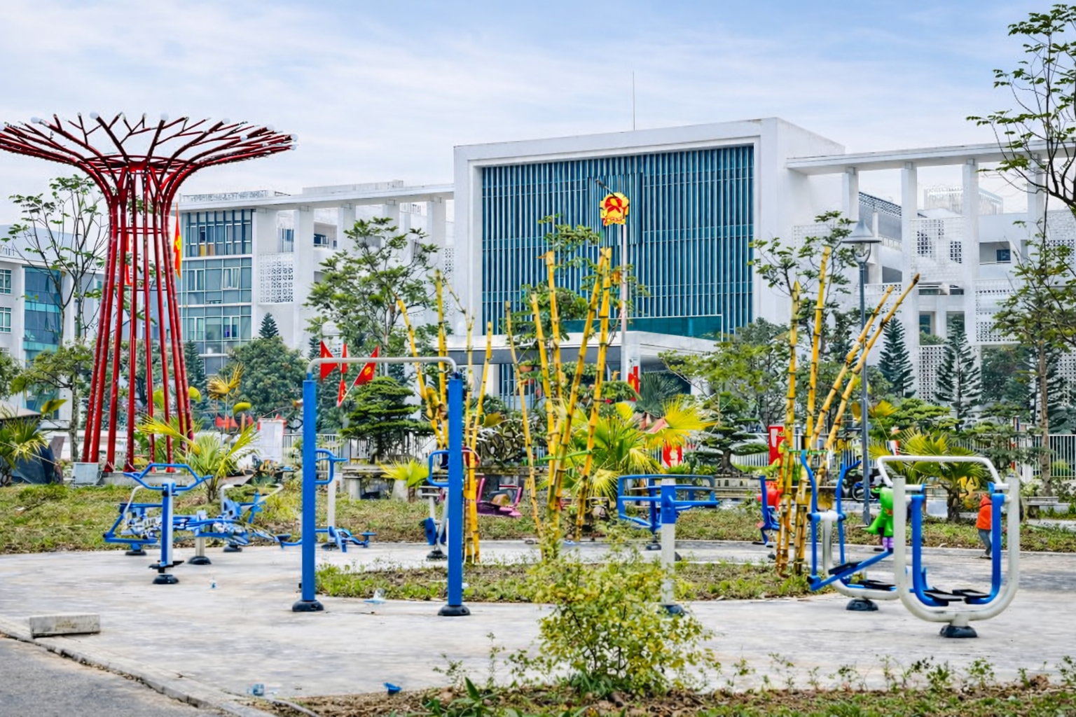 Song song với khu vui chơi trẻ em, khu thiết bị thể dục thể thao ngoài trời được lắp đặt đồng bộ nhằm phục vụ nhu cầu rèn luyện sức khỏe của người dân ở nhiều độ tuổi khác nhau. Các thiết bị như đi bộ trên không, đi bộ lắc tay, thiết bị tập toàn thân, xà đơn kết hợp xoay eo, thiết bị tập chân được bố trí khoa học, khoảng cách hợp lý, thuận tiện cho người dân tập luyện hàng ngày. Khung thiết bị được làm từ thép dày, sơn tĩnh điện cao cấp, có khả năng chống gỉ sét, chịu được điều kiện thời tiết khắc nghiệt khi lắp đặt ngoài trời.
