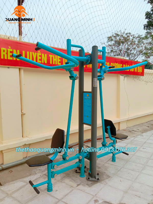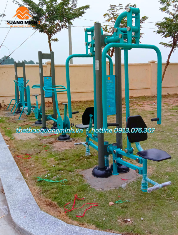Các thiết bị trụ đôi được Thể Thao Quang Minh lắp đặt tại khu vực này mang gam màu xanh ngọc chủ đạo kết hợp với khung thép xám, một phối màu đặc trưng giúp thiết bị nổi bật mà vẫn giữ được vẻ trang nhã.