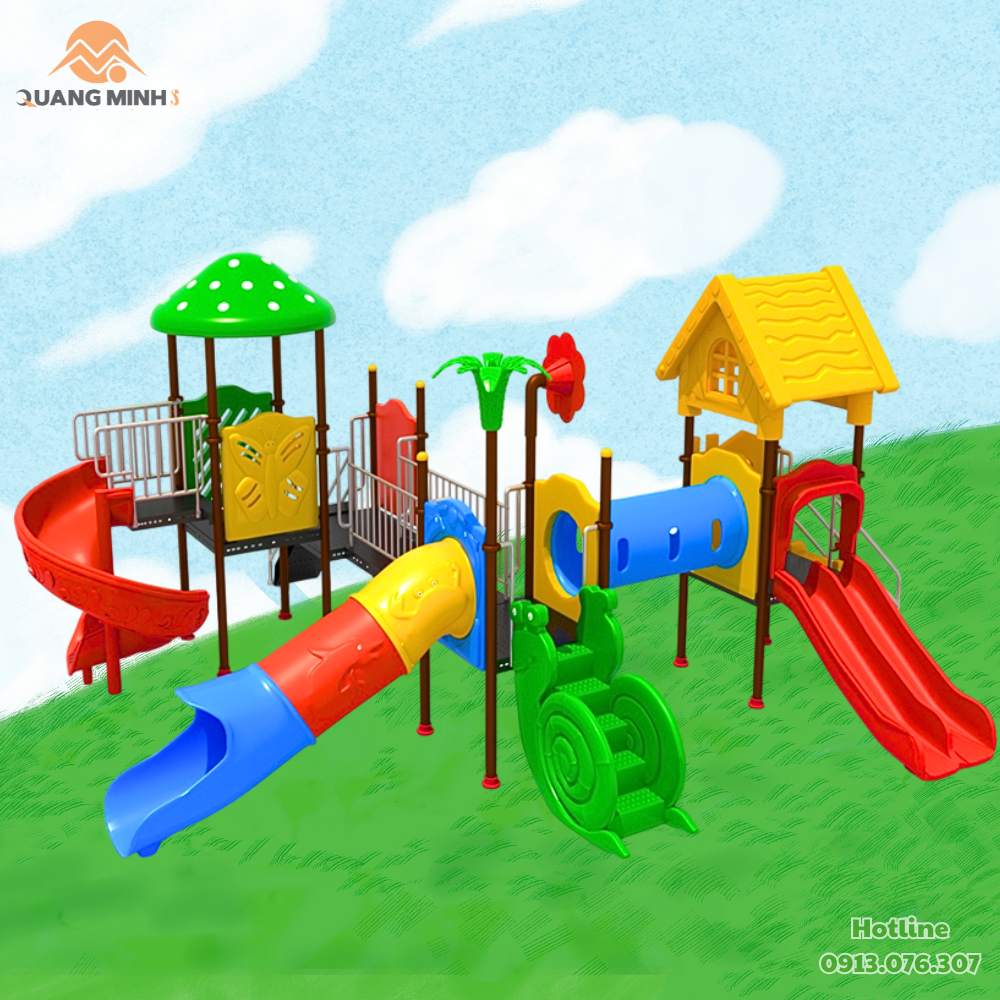 Vật liệu: Khung thép mạ kẽm nhúng nóng, sơn tĩnh điện chống gỉ sét; con giống bằng nhựa LDPE đúc liền khối an toàn cho trẻ, màu sắc tươi sáng, phù hợp để sử dụng ngoài trời.